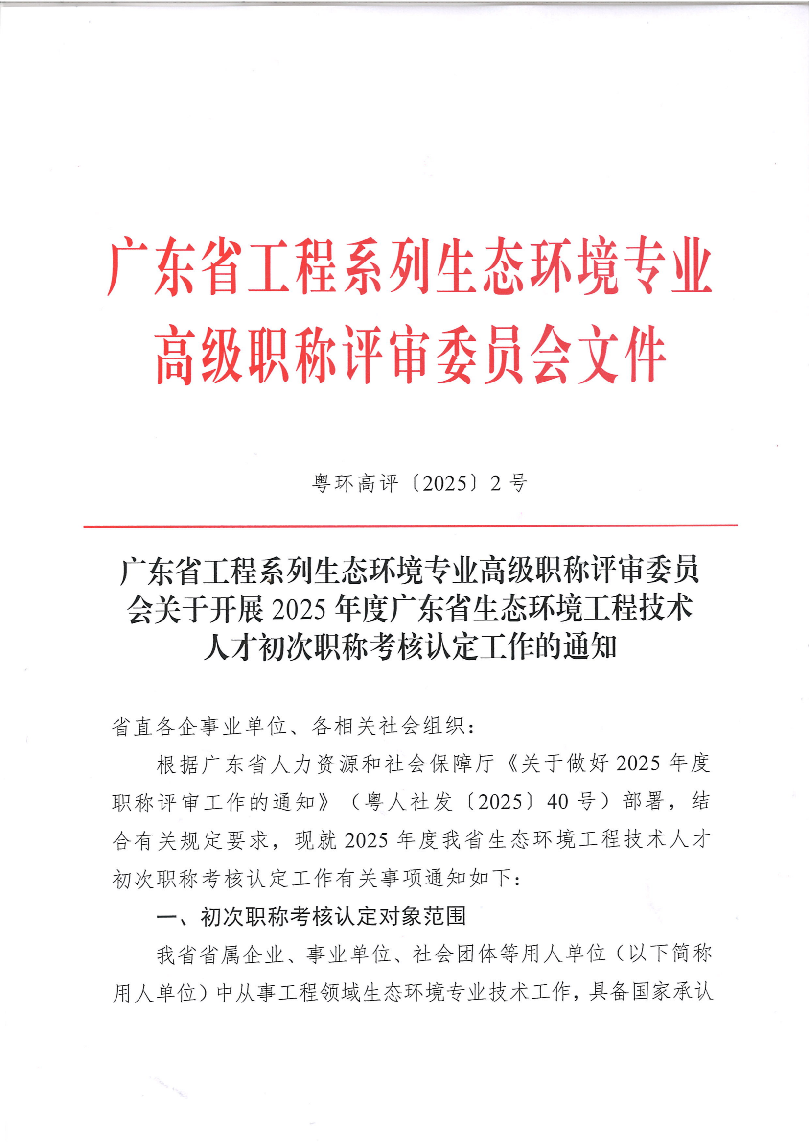 广东省工程系列生态环境专业高级职称评审委员会关于开展2025年度广东省生态环境工程技术人才初次职称考核认定工作的通知