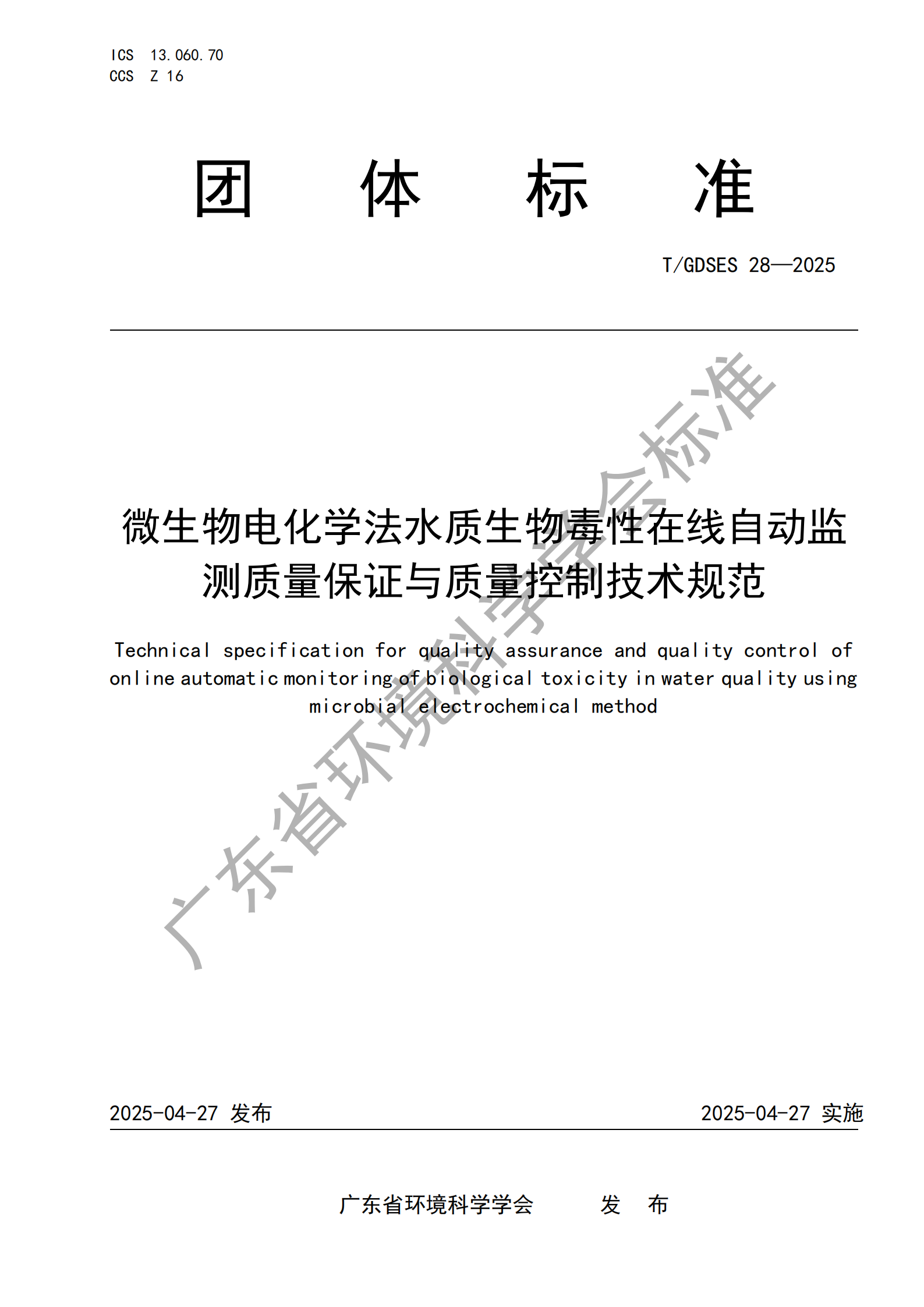 T/GDSES 28—2025《微生物电化学法水质生物毒性在线自动监测质量保证与质量控制技术规范》