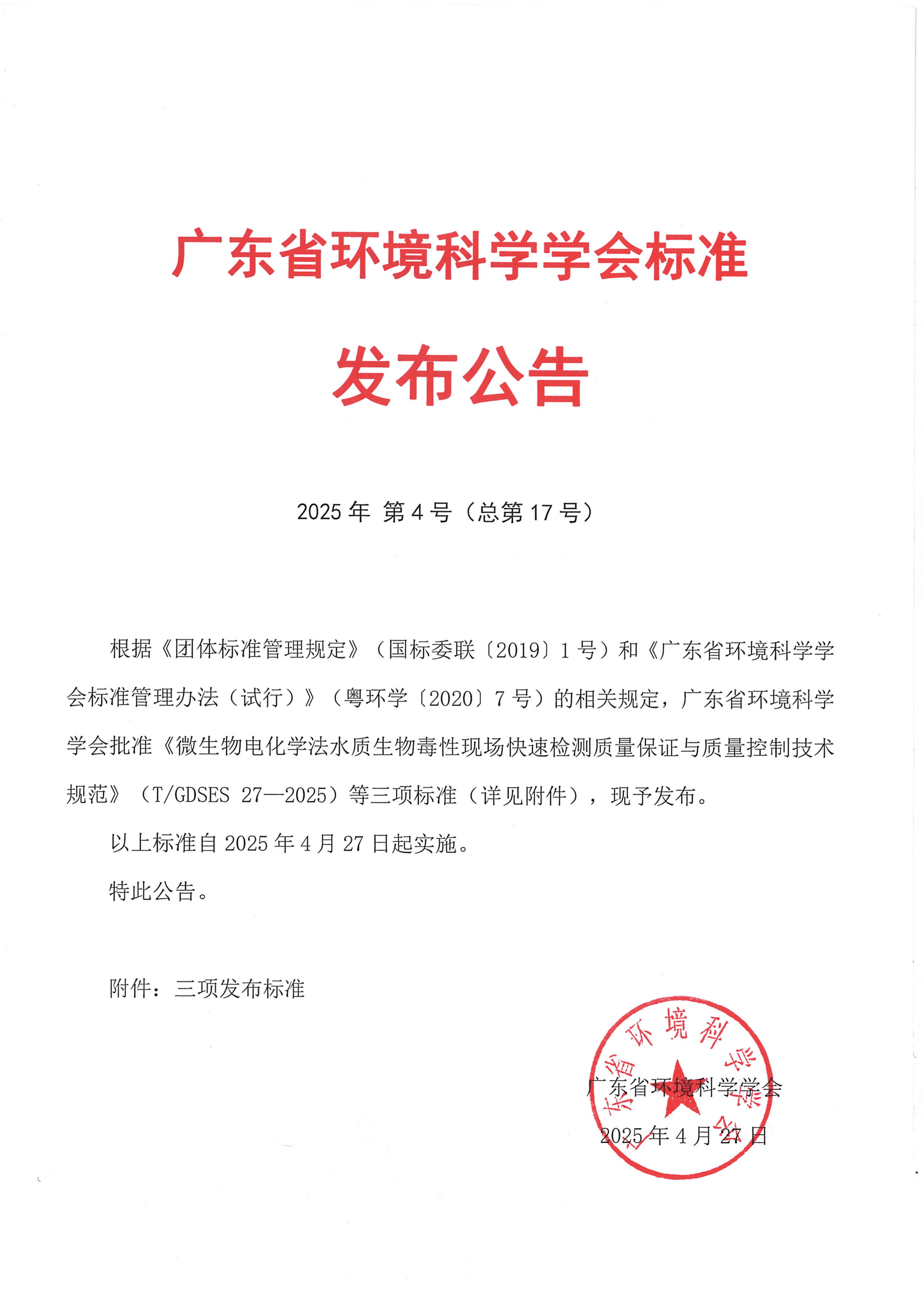 广东省环境科学学会标准发布公告-2025年 第4号(总第17号)