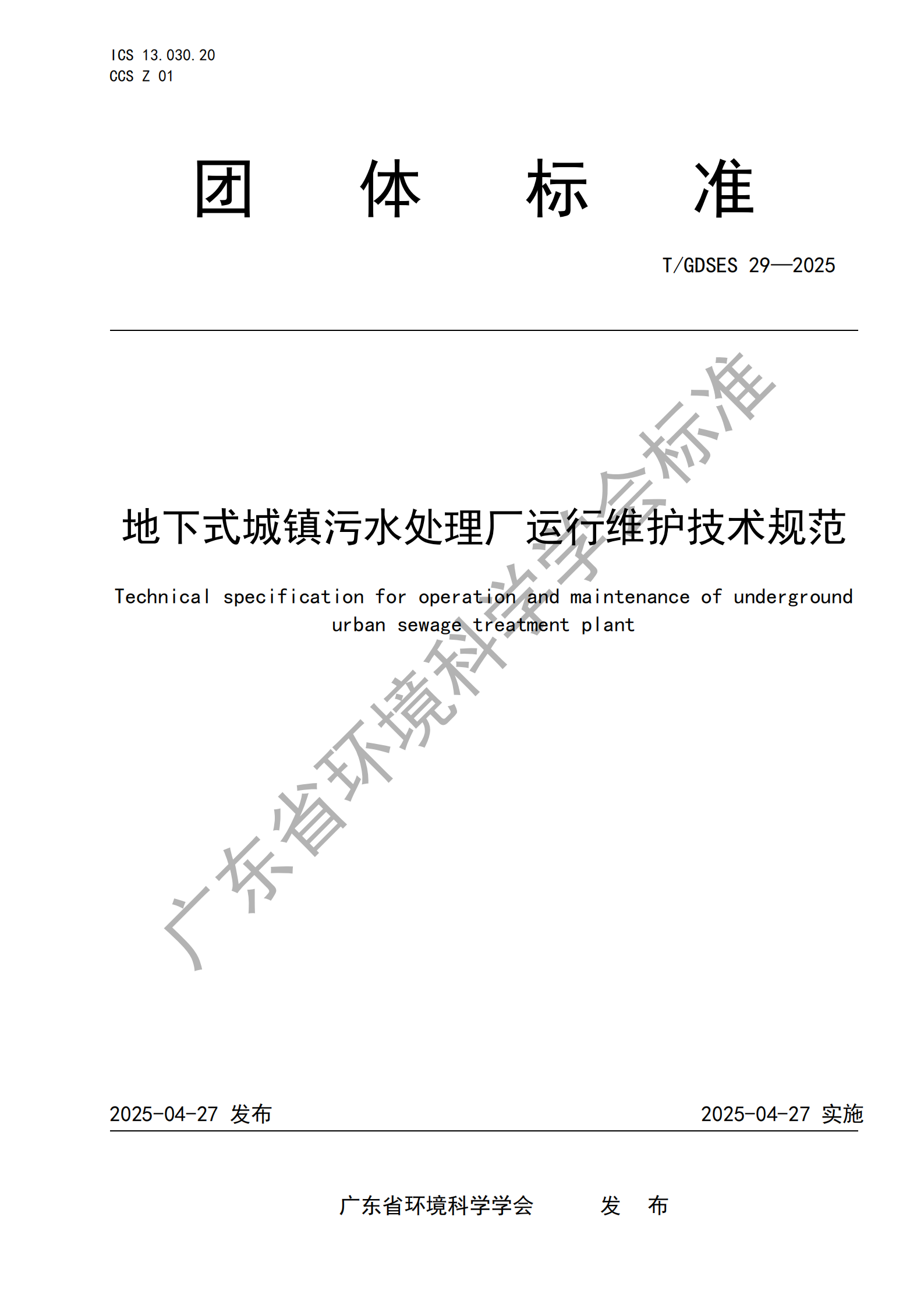 T/GDSES 29—2025《地下式城镇污水处理厂运行维护技术规范》