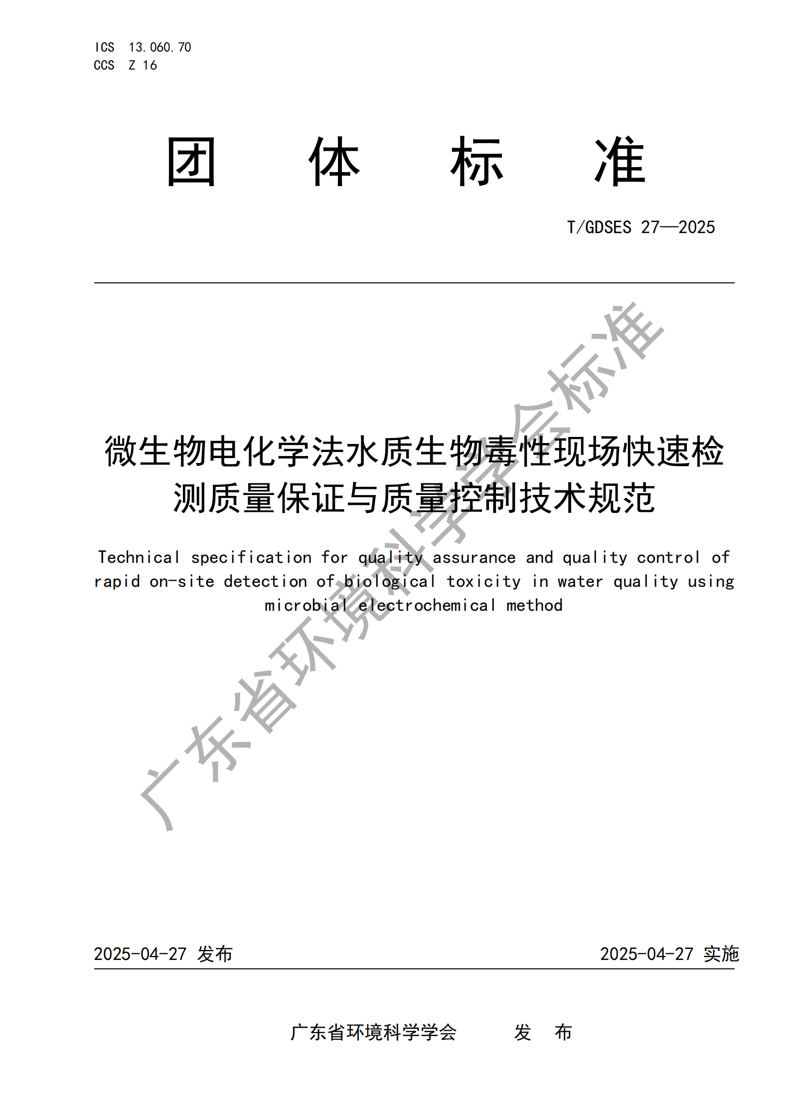 T/GDSES 27—2025《微生物电化学法水质生物毒性现场快速检测质量保证与质量控制技术规范》