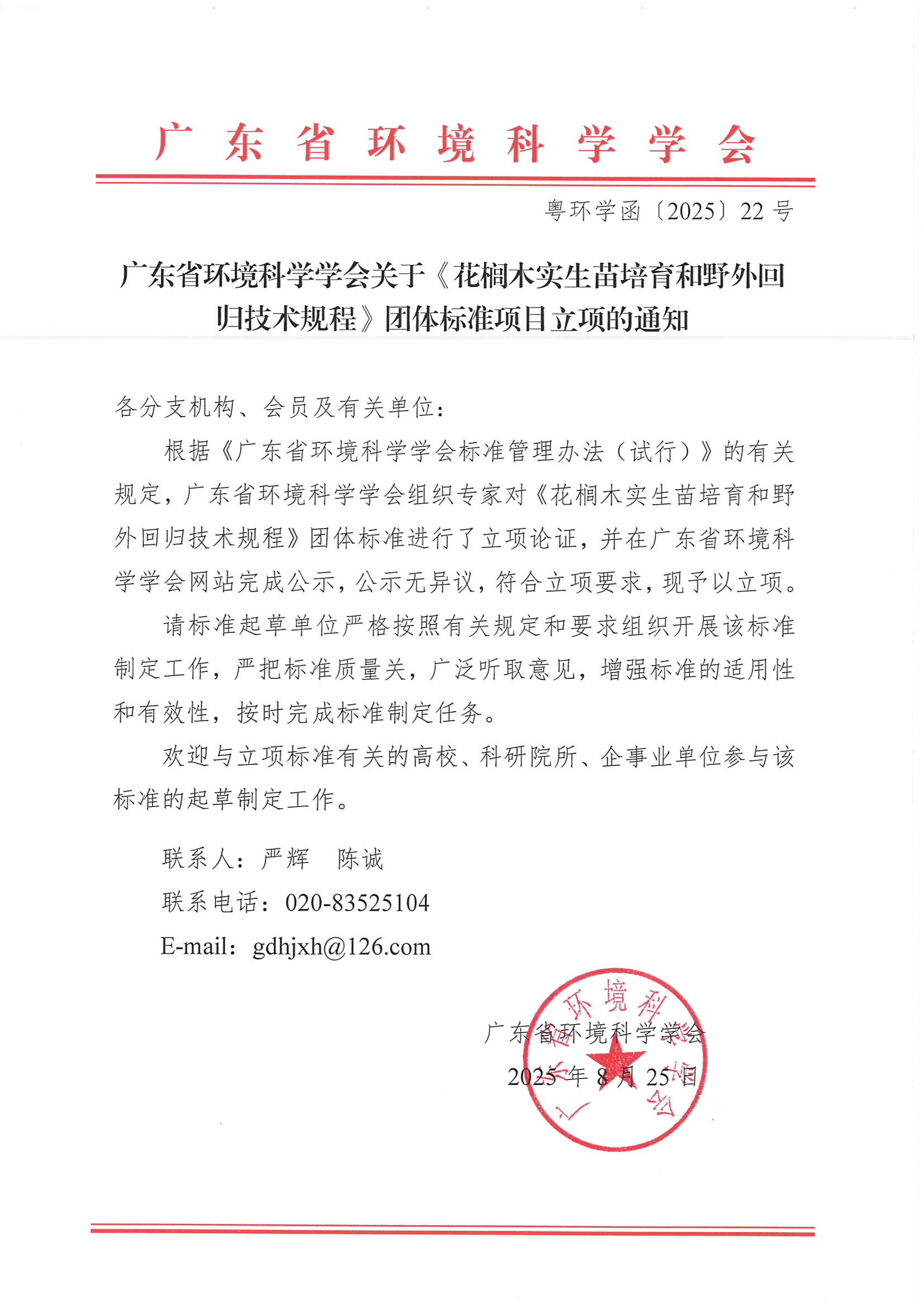 关于《花榈木实生苗培育和野外回归技术规程》团体标准项目立项的通知