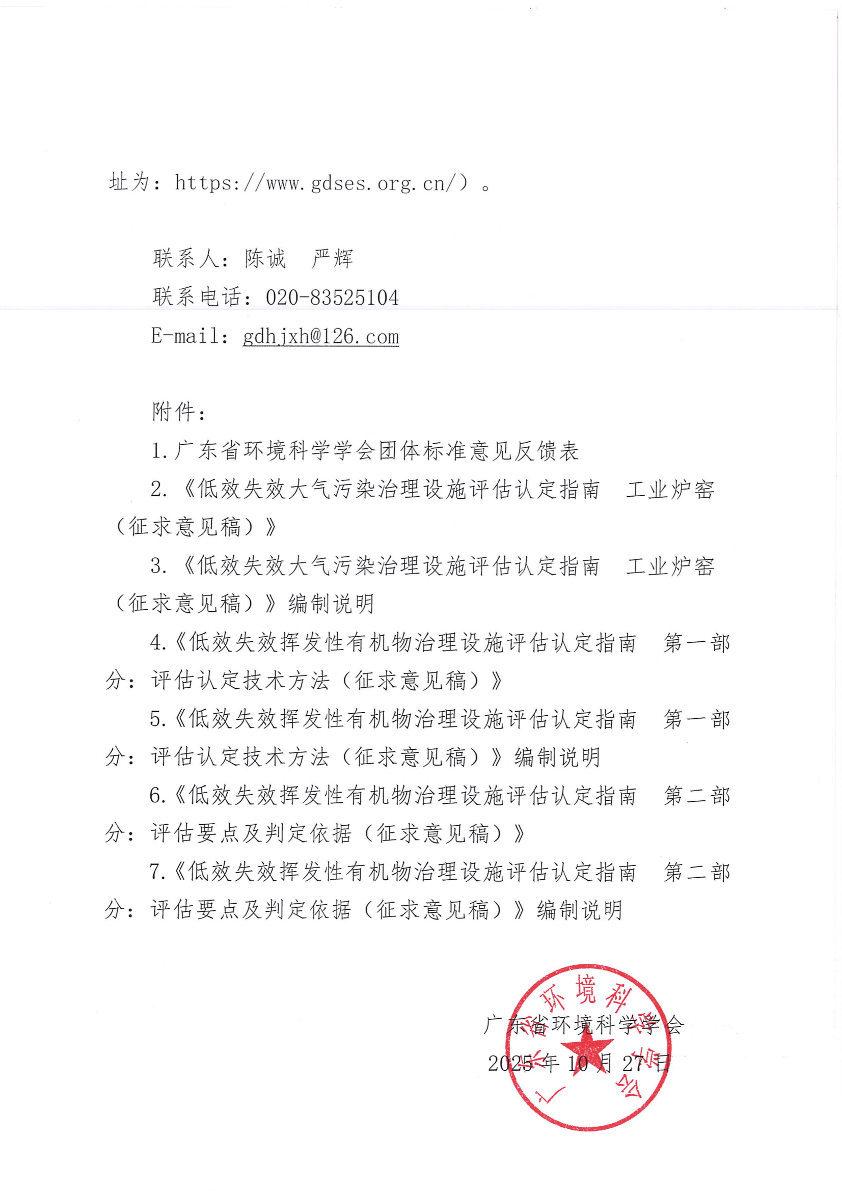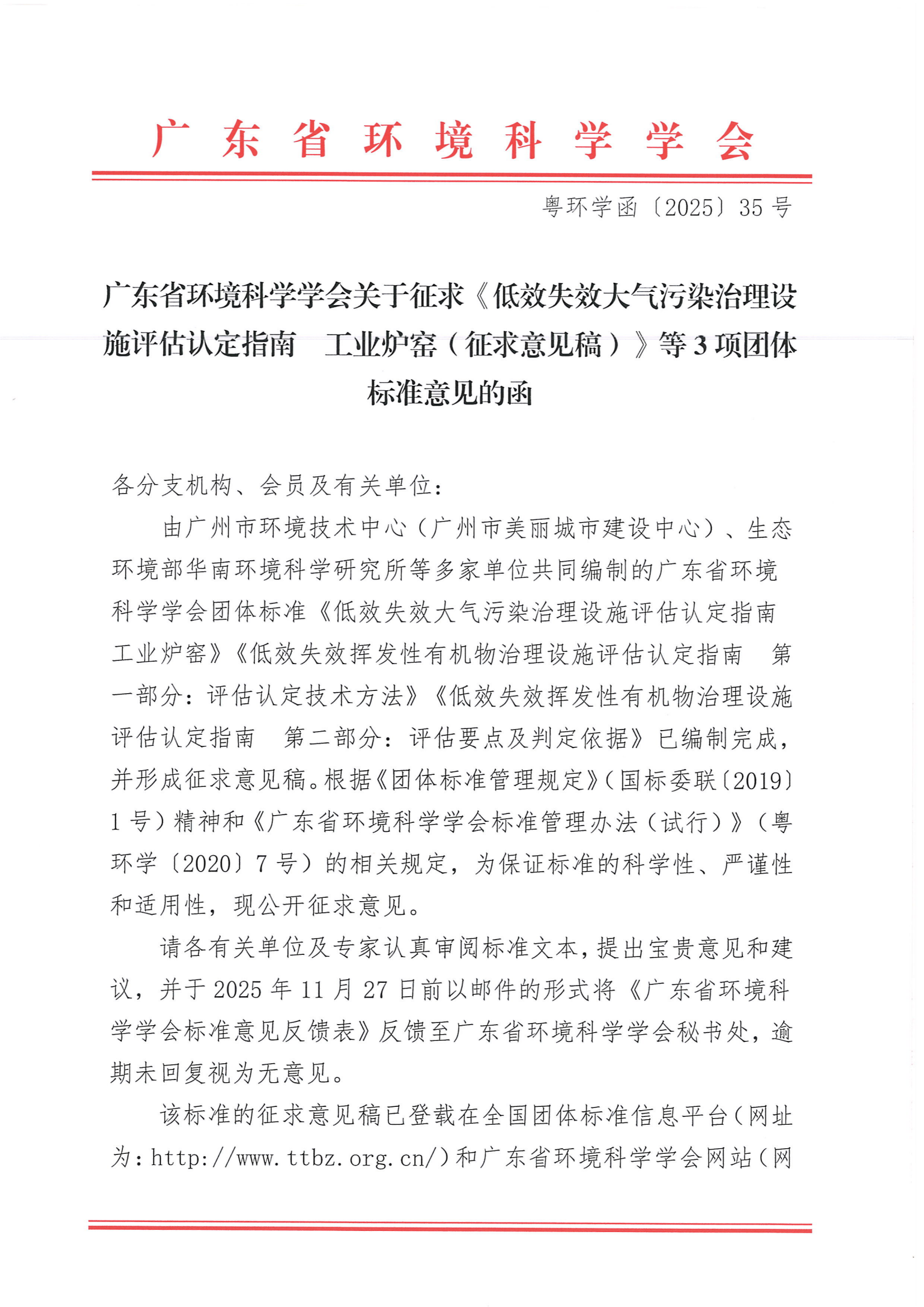 关于征求《低效失效大气污染治理设施评估认定指南 工业炉窑(征求意见稿)》等3项团体标准意见的函