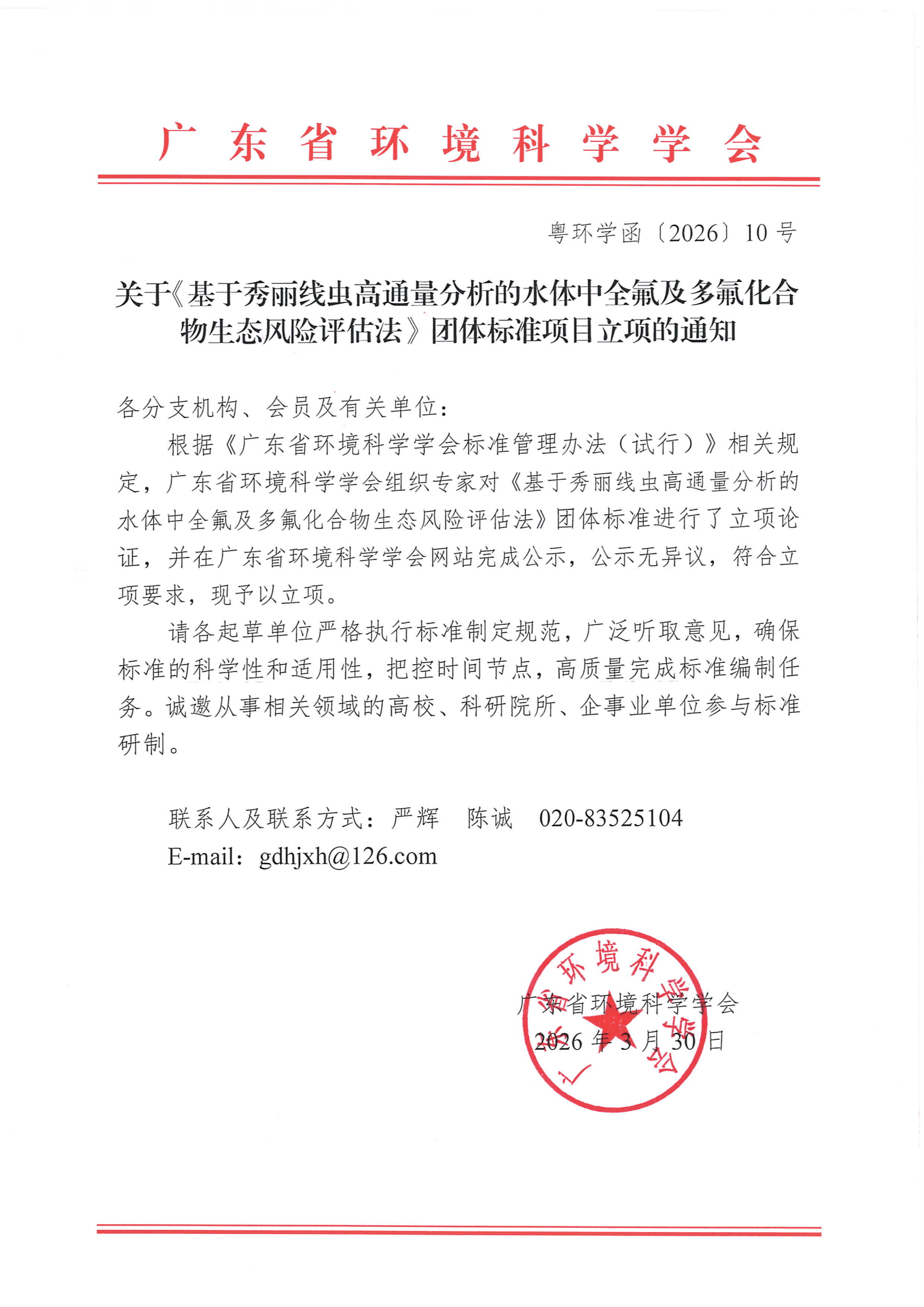 关于《基于秀丽线虫高通量分析的水体中全氟及多氟化合物生态风险评估法》团体标准项目立项的通知
