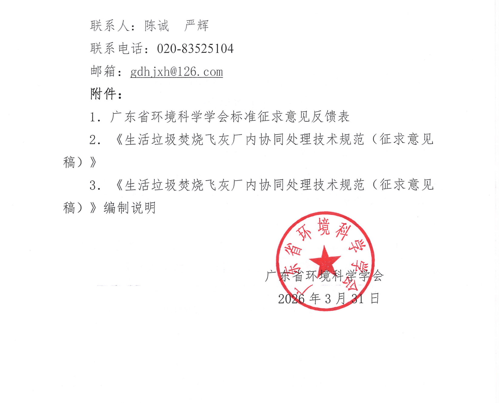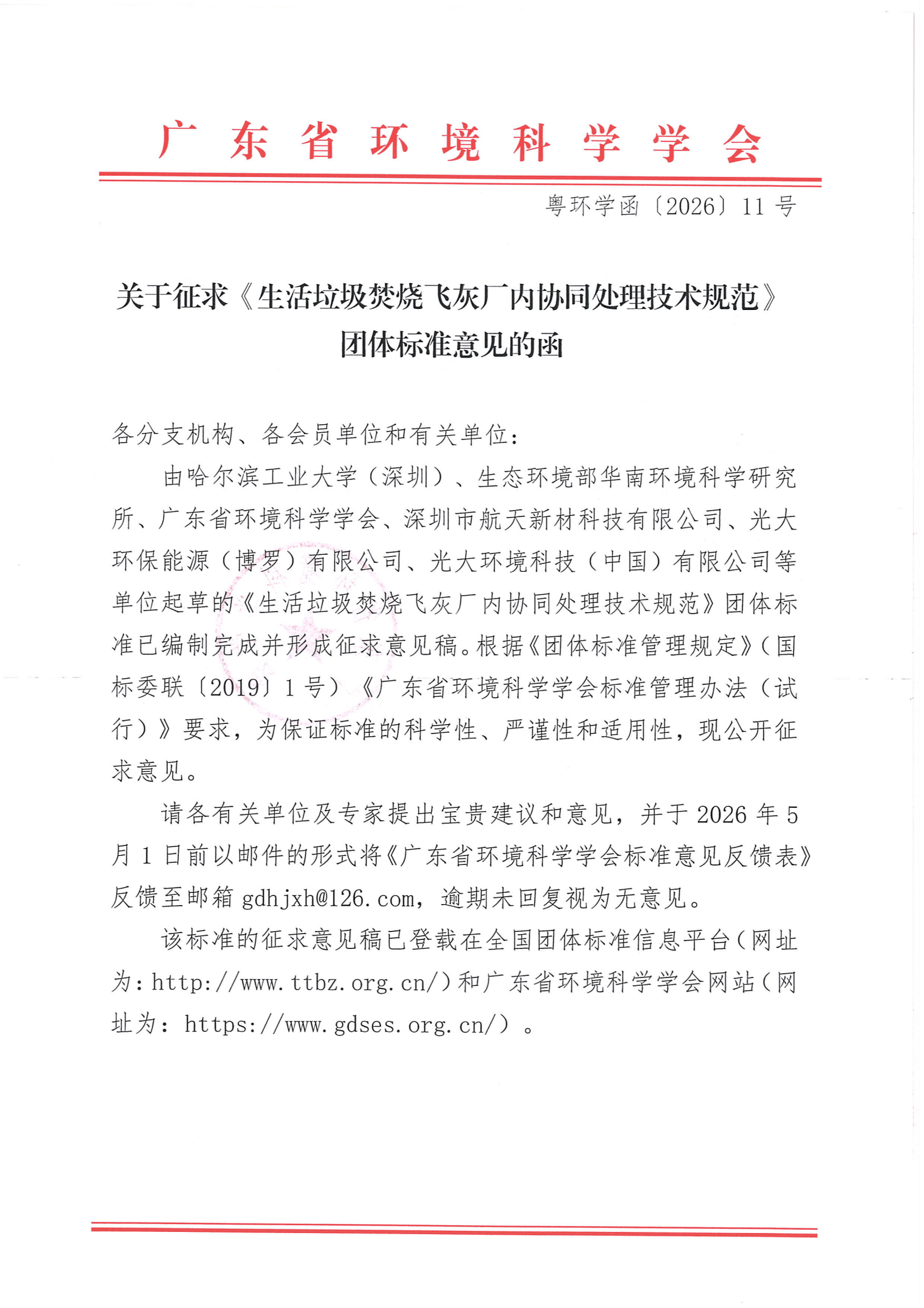 关于征求《生活垃圾焚烧飞灰厂内协同处理技术规范》团体标准意见的函